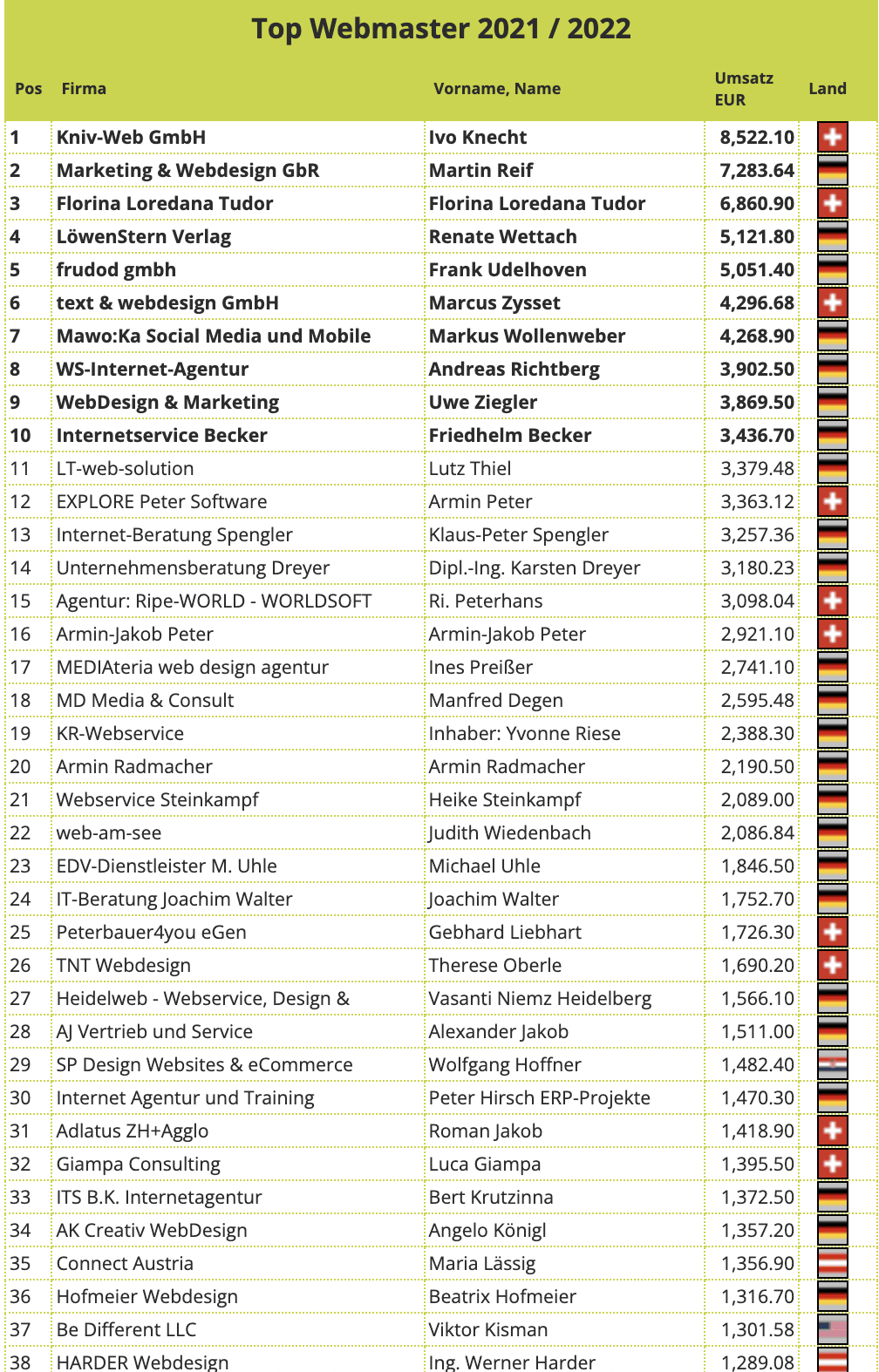 Platzierung Vorname Nachname Umsatz